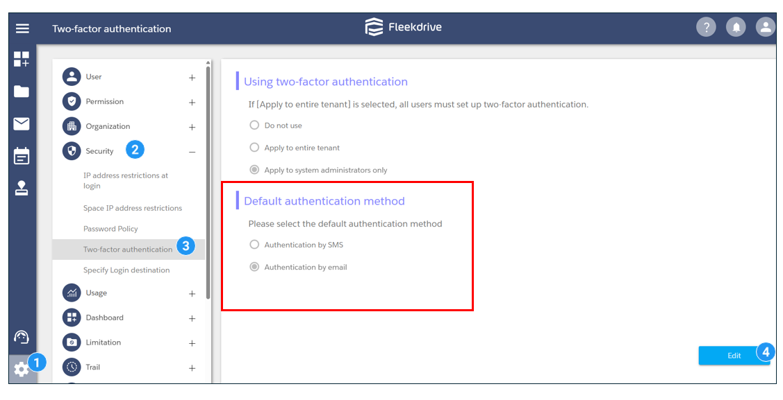 | Apply to system administrators only | Use two-factor authentication for “system administrator” only ※Only for the Fleekdrive default “System Administrator”. |