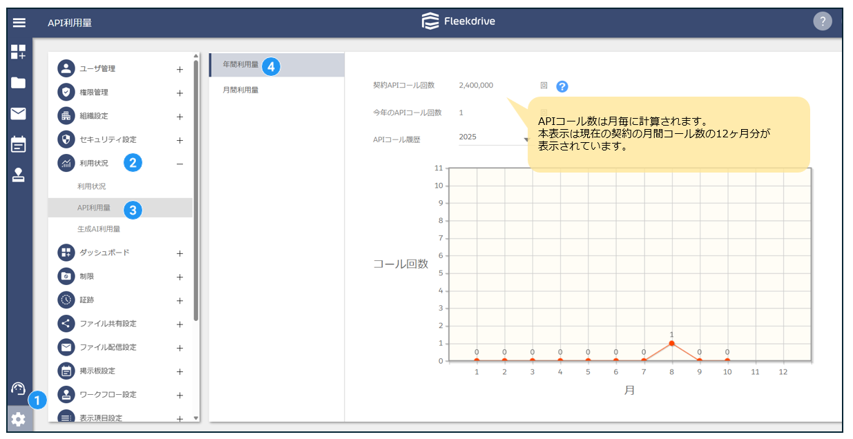 「年間利用量」タブでは年ごとのAPI利用量やコール回数の最大値をグラフで確認できます。