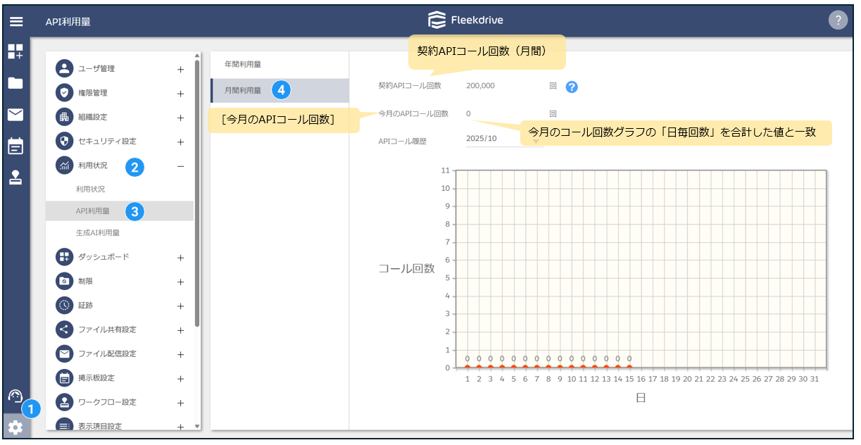 「月間利用量」タブでは月ごとのAPI利用量やコール回数の最大値をグラフで確認できます。