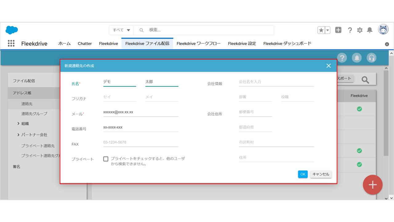 Fleekdriveファイル配信タブより連絡先を開きます。