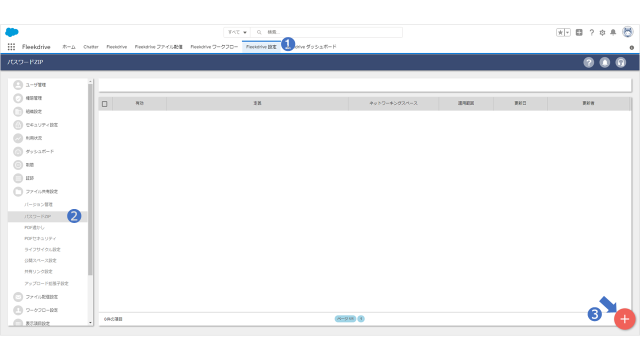 Fleekdrive設定より、パスワードZIP画面を開きます。