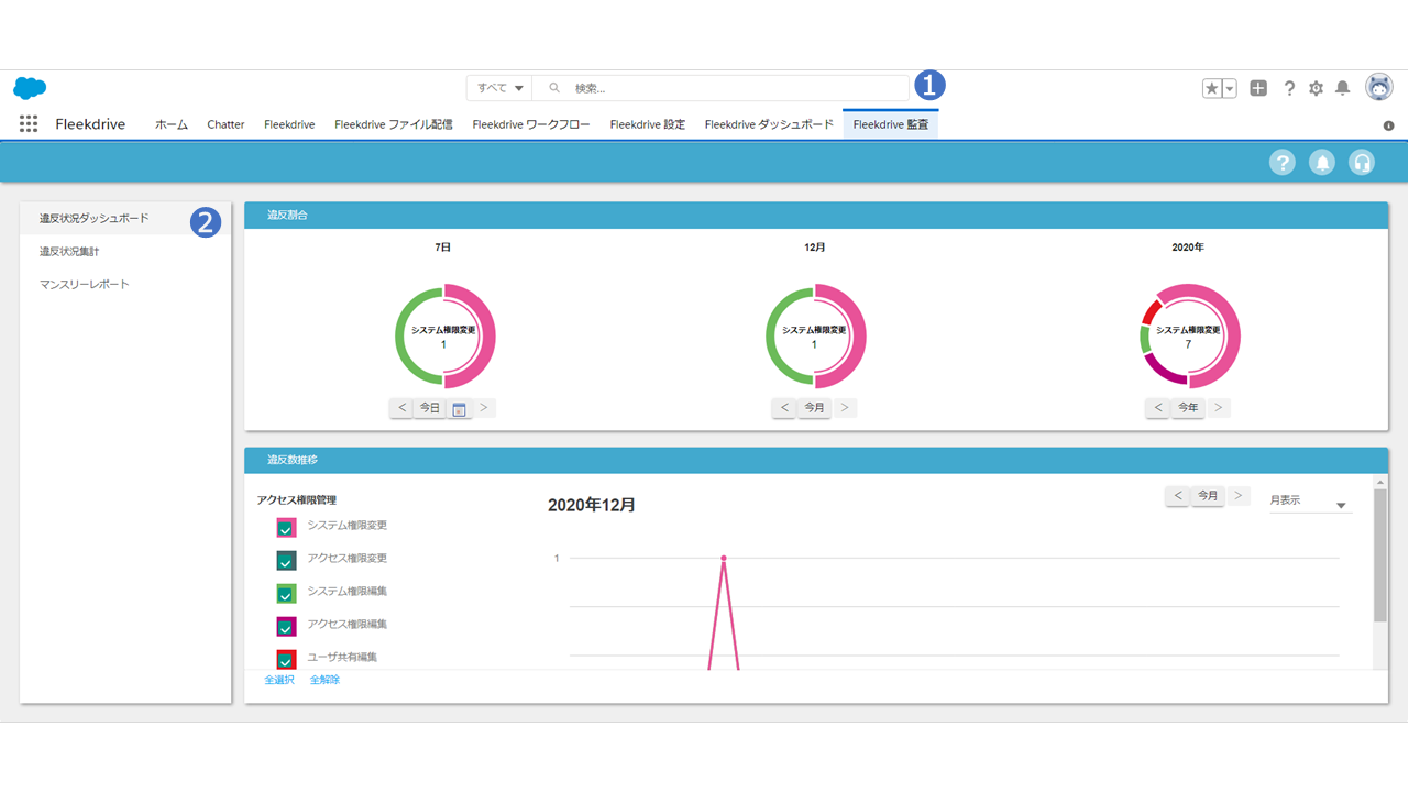 Fleekdrive監査>違反状況ダッシュボードを開くと、違反割合、違反数推移の確認ができます。日別、月別、年別にて選択が可能です。
