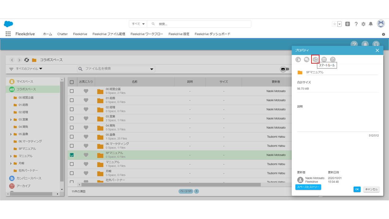 「Fleekdrive」タブより、スマートルールを設定するスペースを選択し、「プロパティ」をクリックします。