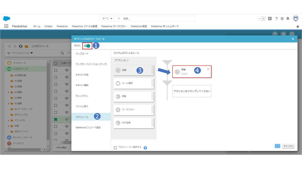 「スケジュール」タブを選択し、アクションの「待機」をフロー欄へドラッグ&ドロップで移動させます。