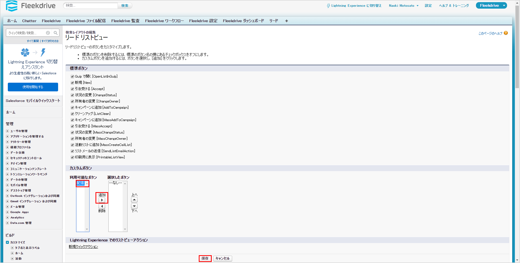 Salesforceの設定画面を開き、左側のツリーメニューの【ビルド】>【カスタマイズ】>【リード】>【検索レイアウト】を表示します。