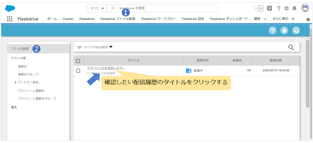 「Fleekdriveファイル配信」タブを開き、内容を確認したい履歴の「タイトル」をクリックします。