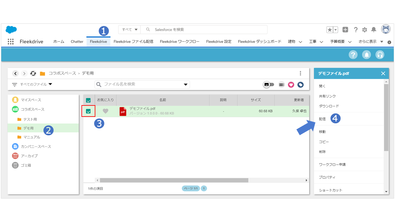 配信したいファイルにチェックを入れて、「配信」をクリックします。