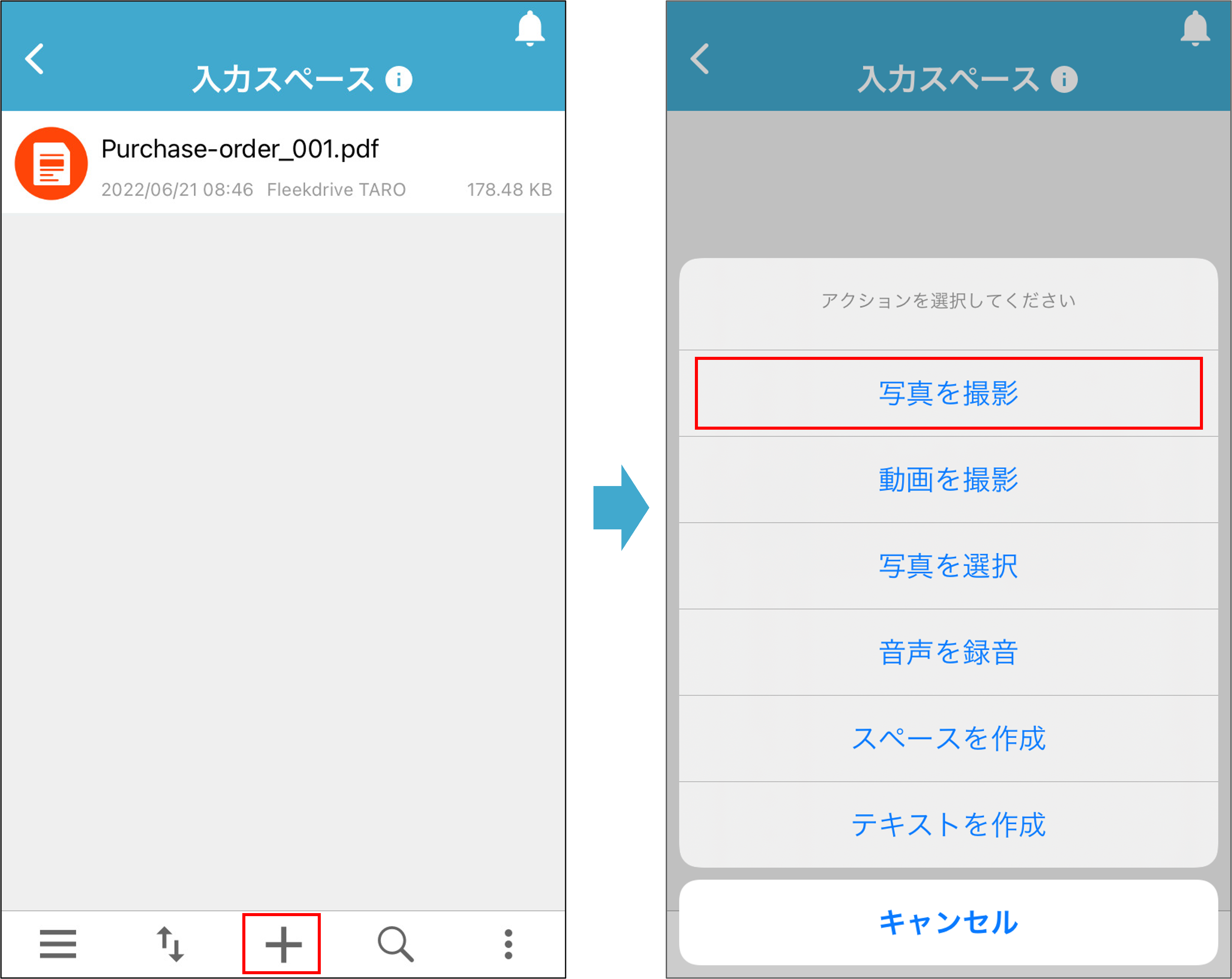 Fleekdriveモバイルアプリでは、入力スペースに保存済みのファイル・モバイル端末に保存されているファイル・モバイル端末で新たに撮影する写真ファイルを受領申請することができます。